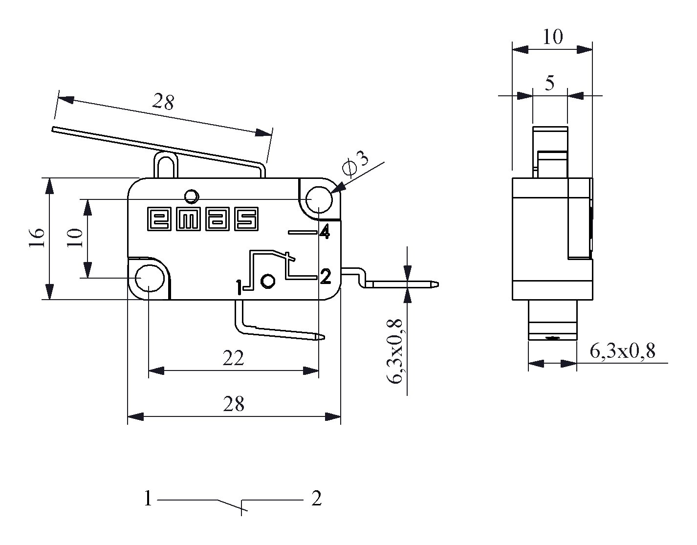 MK1KIM5, Микропереключатель 10А 250VAC с S-образной лапкой |