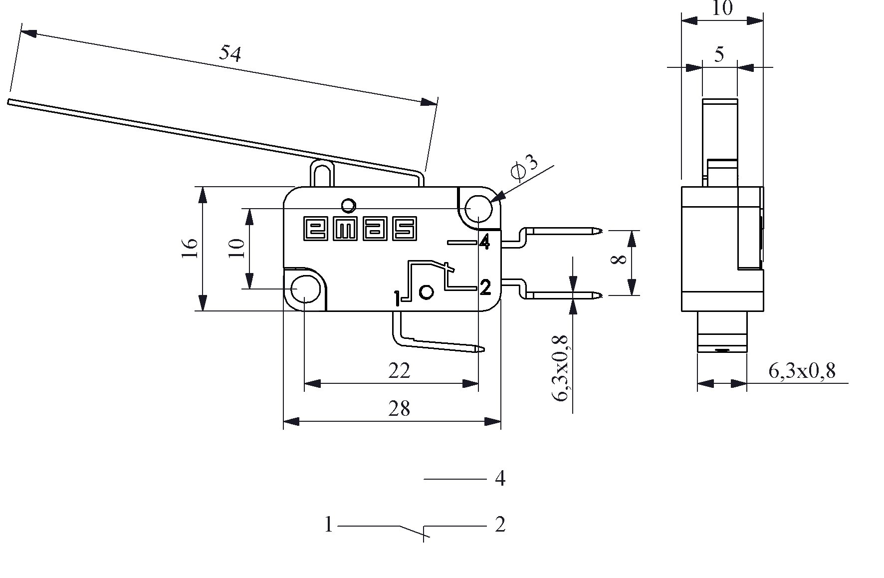 MK1KIM5, Микропереключатель 10А 250VAC с S-образной лапкой |