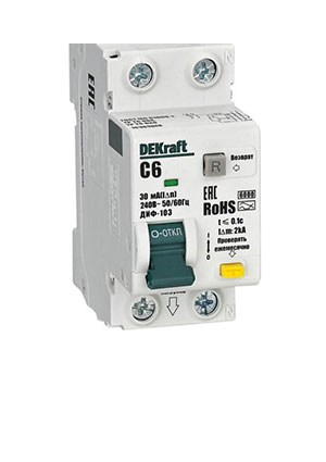 Автоматические выключатели дифференциального тока серии ДИФ-103 6кА NEW Dekraft; 1P+N; номинальный ток 6 А; ном. диф. ток 30 мА; тип диф. расцепителя - AC; кривая отключения - С; Icn, Ics = 6 кА; тип устройства - электронный; монтаж – на DIN-рейку. АВДТ обеспечивают три вида защиты — от короткого замыкания, перегрузки и возникновения утечки тока (в частности, вследствие прикосновения человека к токоведущим частям).