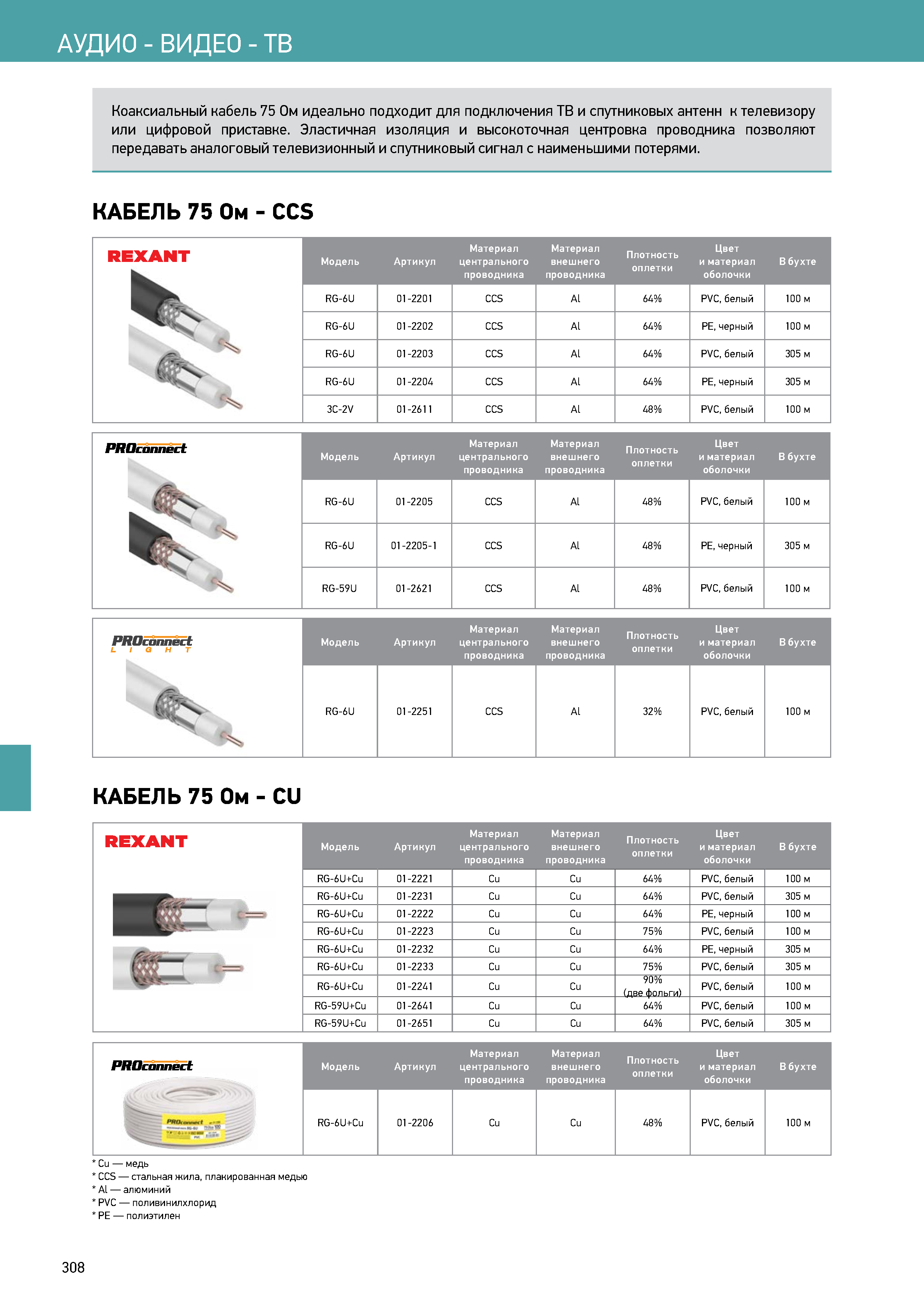 Кабель коаксиальный RG-6U, 75Ом, Cu/Al/Cu, 64%, 100м, INDOOR, белый (datasheet)