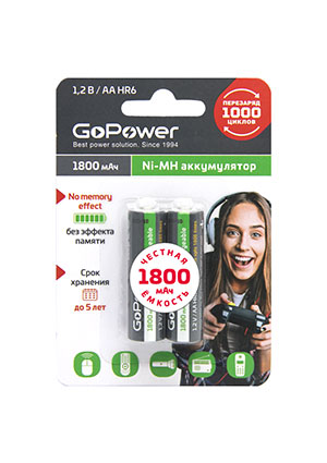 Артикул: Аккумулятор бытовой GoPower HR6 AA BL2 NI-MH 1800mAh (2/20/240)