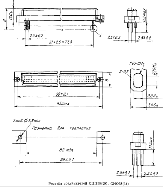 Вилки соединителей предназначены для установки и монтажа пайкой на сменной печатной плате. Розетки СНП58/59 устанавливаются на монтажной плате, присоединение к проводам осуществляется методом модицифированной накрутки двух одножильных проводов с диаметром жилы 0.2-0.25 мм. Розетки СНО63/64 предназначены для монтажа пайкой одного провода сечением до 0.2 кв.мм или двух проводов сечением до 0.14 кв.мм каждый.
