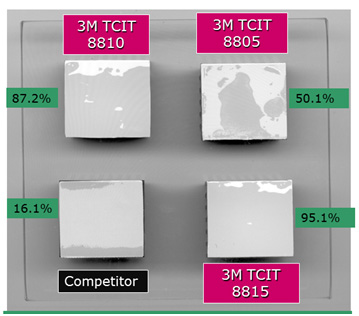 Подложки серии 8810 имеют повышенную толщину, за счет чего более плотно прилегают к поверхности радиатора и заполняют неровности его микрорельефа. На рисунке приведены результаты теста на смачиваемость подложек серии 88хх и подложки конкурента. После приложения усилия в 50 psi в течение 10 секунд подложка 8810 демонстрирует смачиваемость в 87,2% по сравнению с 16,1% конкурента.