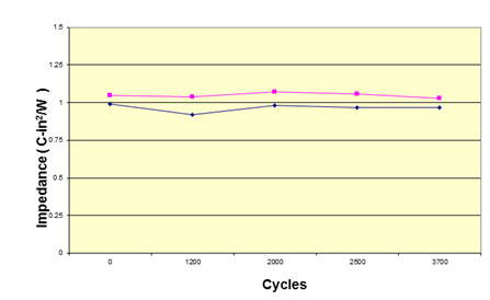На рисунке показан график испытаний на ударную прочность, изменение термосопротивления при резких скачках температуры в диапазоне -55…+125°С с цикличностью 3 часа. По результатам после 10,000 часов испытаний термосопротивление подложки 8810 не изменилось.