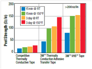 На следующем графике показана прочность на отрыв и усилие сдирания для обычной теплопроводящей ленты, ленты 3М и ленты серии VHB также от 3М. Столбики разных цветов указывают на температурные режимы.