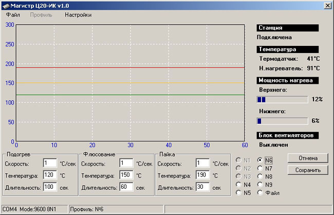 Паяльно-ремонтные станции Ц20-ИКМ могут управляться с помощью персонального компьютера по последовательному интерфейсу RS-232. Подключение к ПК значительно расширяет функциональные возможности станции — помимо выбора исходных параметров он позволяет визуализировать заданные и текущие значения пайки, а также использовать неограниченное количество термопрофилей для различных плат и микросхем. Соединение блока управления и ПК обеспечивается через стандартный удлинительный кабель (нуль-модемный RS-232) с разъемами DB9S и DB9Р, также возможно использование преобразователей USB-COM.